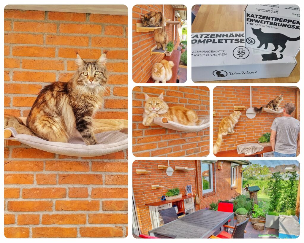 Da Ulysseus und ich ja keine gewöhnlichen 4-kg-Normalos sind und unser Außengehege auch noch ein kleines Upgrade brauchte, hat sich unser Personal beim WooWood-Kundenservice schlau gemacht, ob alles auch für unser überdachtes Freigehege geeignet ist. Im Familienrat waren wir uns schnell einig: Wir nehmen das Woowood Kletterwand-Hängematten-Set mit 2 Hängematten, 3 Katzentreppen und die Katzentreppenwand XL.