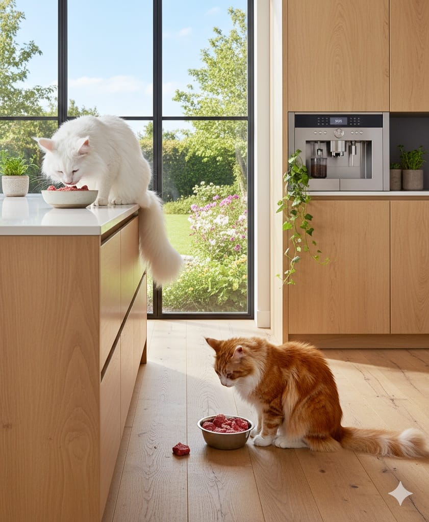 Wenn’s ums Futter geht, vergessen wir oft unsere Differenzen – aber Vorsicht, das Thema ist heikel. Mehrere Katzen dicht beieinander zu füttern, erzeugt subtilen Stress. Denn der Nahrungskonkurrent ist viel zu nah dran und so fangen wir mit dem schlingen an. Und das ist gar nicht gut!